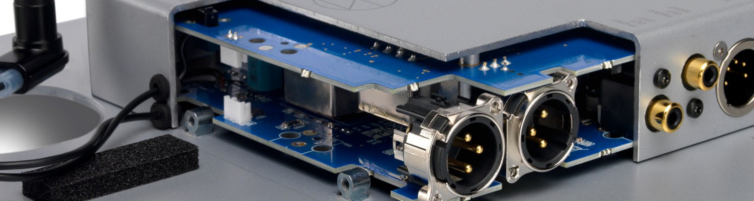 Due to a custom-designed toroidal mains transformer with a static shielding, the strong and seriously oversized external power supply ensures a particularly safe operation. Neutrik XLR connectors with gold-plated pins provide the safe contact between audio section and PWX power supply; the cable between audio and power section is shielded. Furthermore, the two housings are made of a non-magnetic material (aluminium) and their top lids are mechanically dampened.